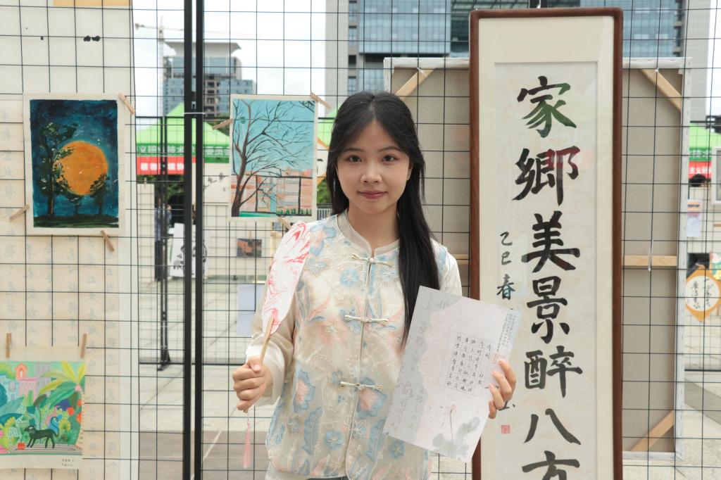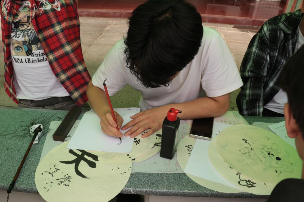 书法体验区墨香四溢,同学们提笔挥毫,有的临摹《离骚》名句,有的写下祝福语。比起手机打字,我更喜欢宣纸上的笔走龙蛇!农业系的蒋馨同学展示着自己的“大作”,虽歪歪扭扭却诚意十足。