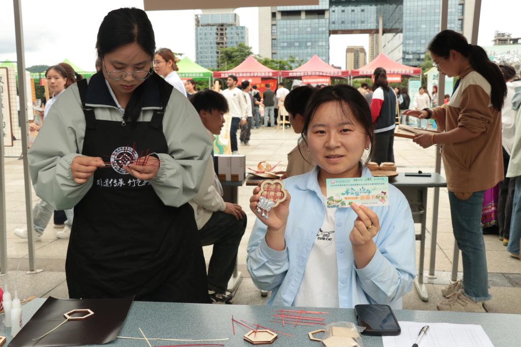 竹条在手里来回穿梭,像燕子的尾巴一样灵活。竹子的红色和黄色交织在一起,好像风都变成了看得见的形状。人文系刘慧芳同学说,开始以为很难,但不一会就上手了,几根竹条在手中逐渐成型,做出专属于自己的端午纪念品。当传统文化从书本走向实践,年轻人自然会为之着迷。