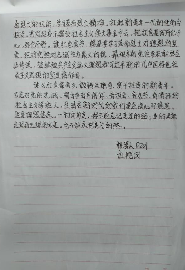 “寒来暑往,白驹过隙,忙忙碌碌中,仰望星空,是什么常常拨动我的心弦,是什么让我产生含泪的感动,是什么让我周身温暖,给我无限的动力?是那些真切的大我,无私的大爱和勇敢的大担当”。这是机电D202班桂久飞同学读完《红色家书》后的真切感受。
