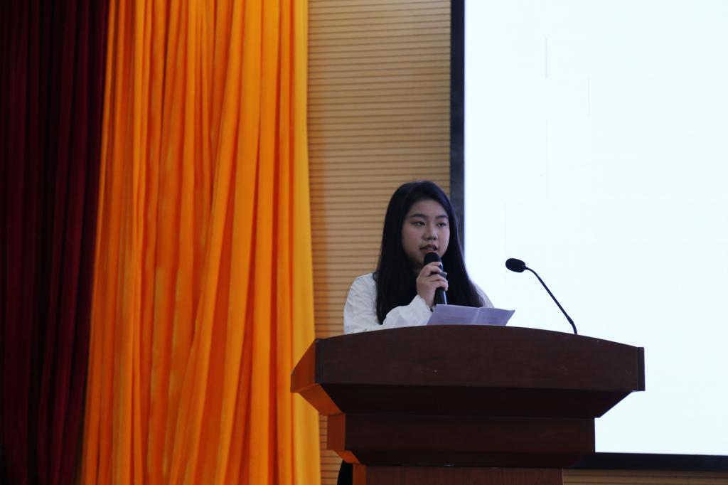 优秀学生干部代表杨爱玲上台发言。她结合自身经历,分享了如何平衡学业与学生工作的心得感悟,表达了对师长栽培、同学支持的感谢,并号召全体同学以实干诠释担当,用热忱践行初心使命。