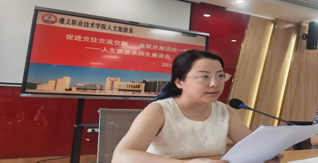 最后,张萌对本次活动进行总结。她充分肯定了活动取得的成效,并强调民族团结是国家繁荣发展、社会和谐稳定的基石。她指出,人文旅游系本身就是一个多元文化交融的大家庭,本系的四个专业覆盖了“人的生命周期”不同阶段,这既是我们专业的特色,也对我们全体师生提出了更高的要求。她结合系的实际情况,提出三点要求:一要胸怀“国之大者”,深刻认识民族团结是社会发展之本,自觉将思想与行动统一到服务大局上来;二要促进交融共进,像石榴籽一样紧紧拥抱在一起,真正在座谈会中、在工作学习中凝聚在一起、融合在一起;三要当好排头兵,希望同学们在专业学习、实习实践中,积极设计民族文化体验活动,将专业所学服务于民族团结事业,如田锦华代表那样,把温暖与团结融入师生氛围、融入社会服务。